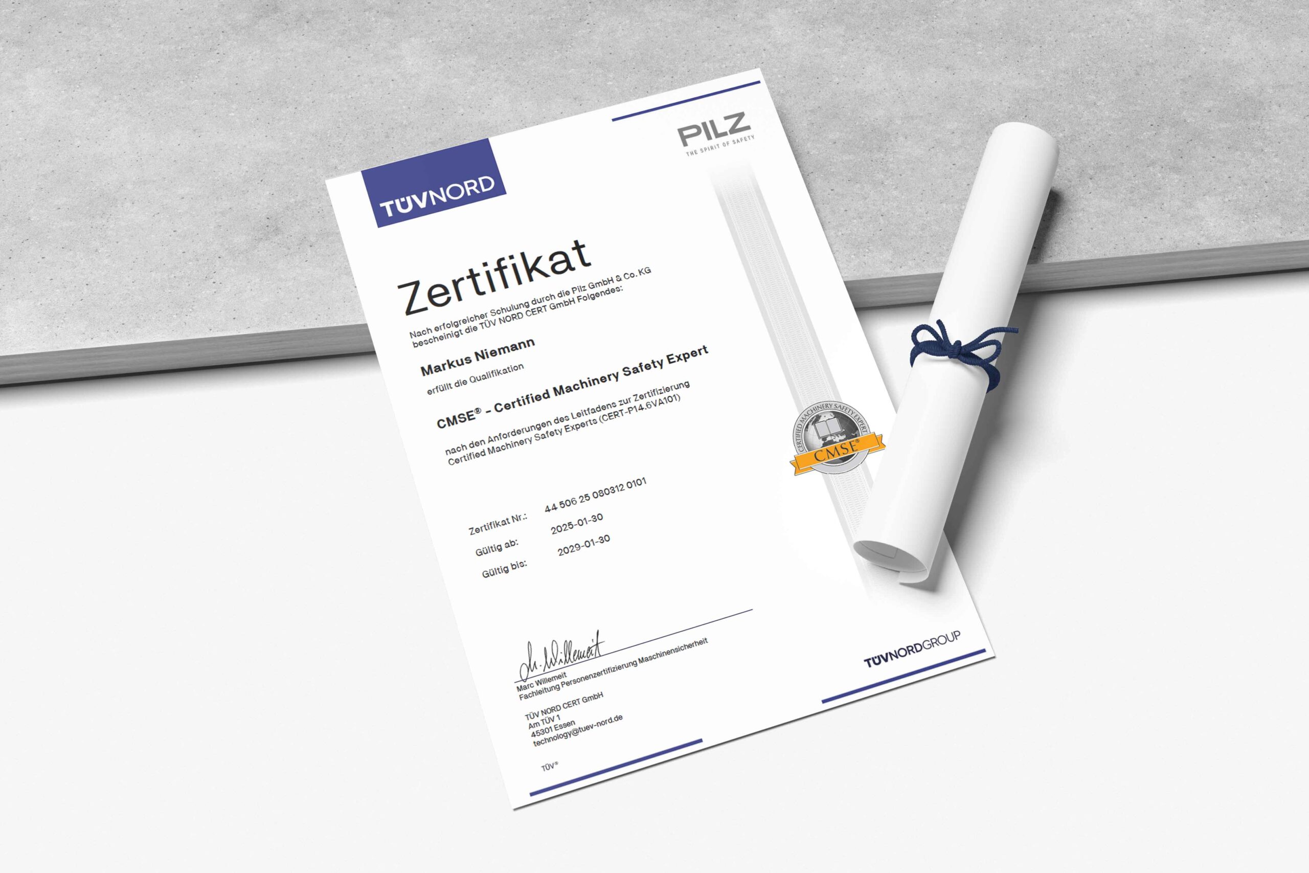 Het was een intensieve opleiding ter voorbereiding op de certificering tot CMSE® – Certified Machinery Safety Expert – een vierdaagse training in Stuttgart, begeleid door TÜV Nord. Elke dag van 8.00 tot 18.00 uur, met een uitdagend examen aan het einde. Dat bestond uit een uitgebreid vragenpakket, waarbij ik minimaal 80% correcte antwoorden moest behalen om te slagen. Het was dus zeker geen wandeling in het park. Ik heb ’s avonds nog flink gestudeerd om alles goed onder de knie te krijgen.