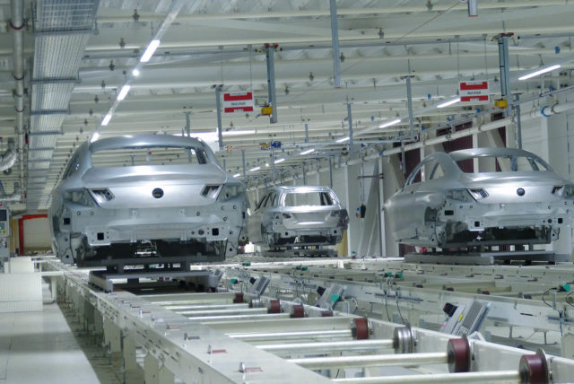 Ook in de automobielsector wordt niet volledig van opslag afgezien. Zowel in de perserij als op de carrosserie-afdeling zijn er voor veel productiefasen speciale opslagplaatsen waar auto-onderdelen en werktuigen worden geleverd.
